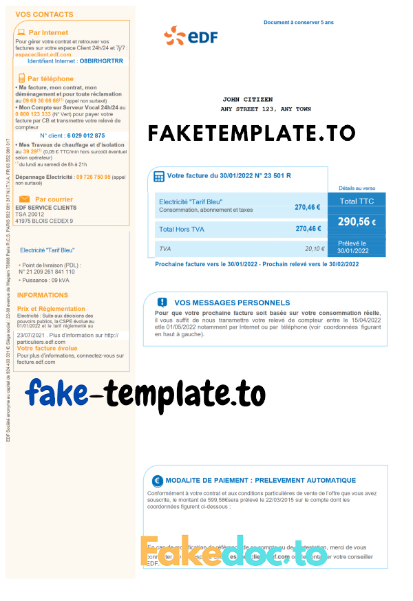 Fully editable template of France electricity EDF utility bill. The template is in doc format, high-quality and easy to fill.