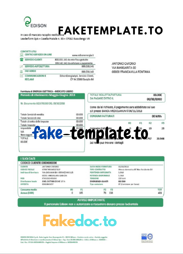 The following template is an editable sample of Italy Edison utility bill in doc format. Edit with MS Word.