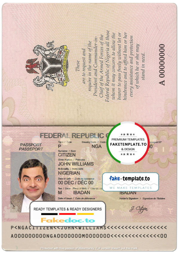Fully editable template of Nigeria passport. The template is in PSD format, high-quality and easy to fill.