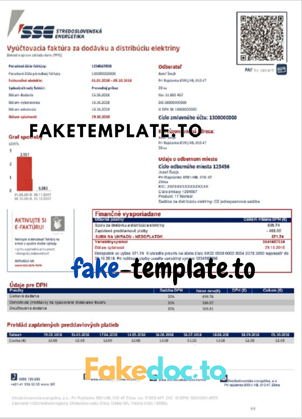 Completely editable Slovakia Stredoslovenka Energetika utility bill template in doc format. High-quality easy fillable template.