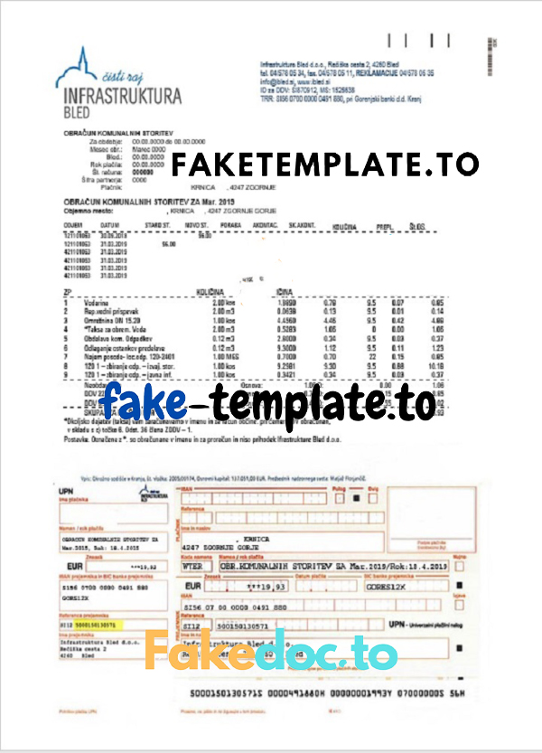 Fully editable template of Slovenia Infrastruktura Bled utility bill. The template is in doc format, high-quality and easy to fill.