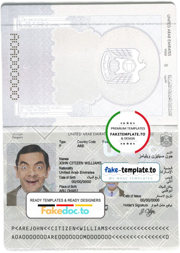 Completely editable United Arab Emirates (UAE) passport template of high quality.