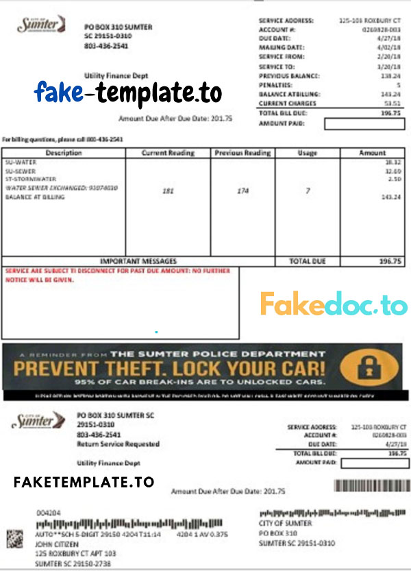 The following template is an editable sample of USA, South Carolia’s City of Sumter water utility bill in doc format. Edit with MS Word.