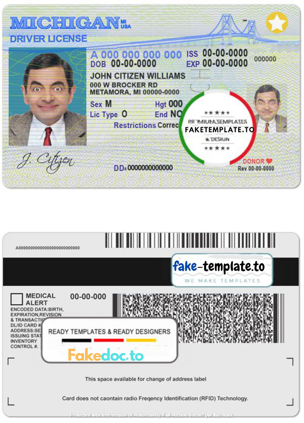 Completely editable United States’ Michigan state driving license template in PSD format.