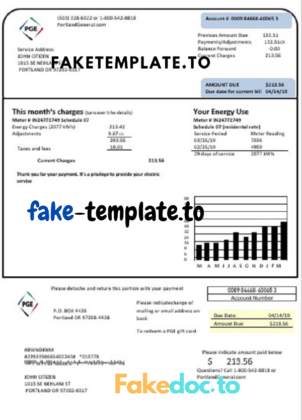 Completely editable United States Oregon PGE electricity utility bill of high quality, which is a proof of the available balance.